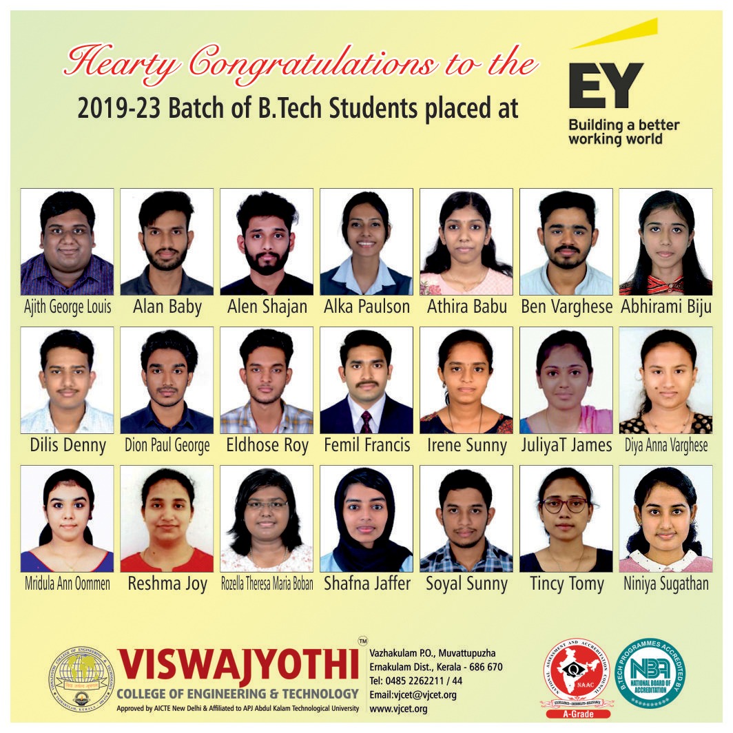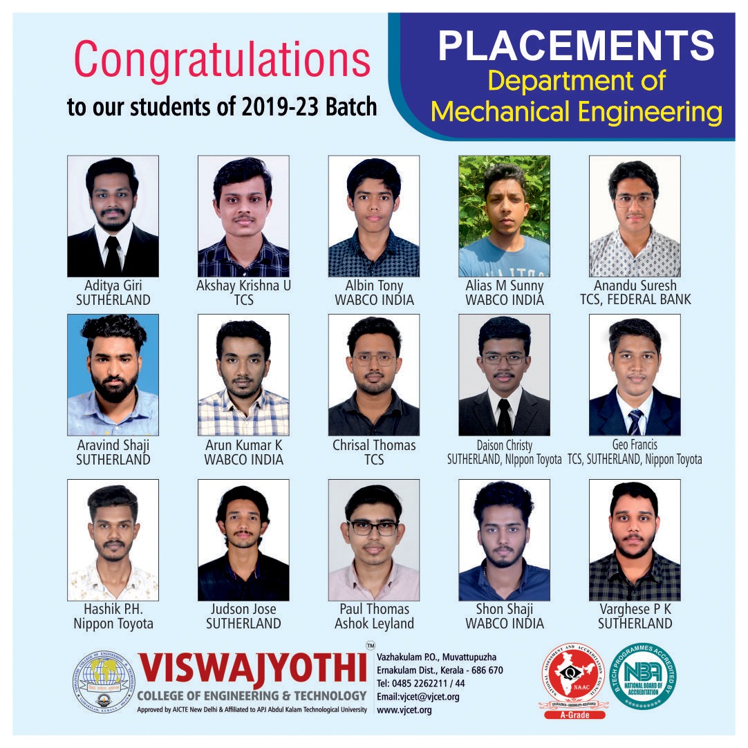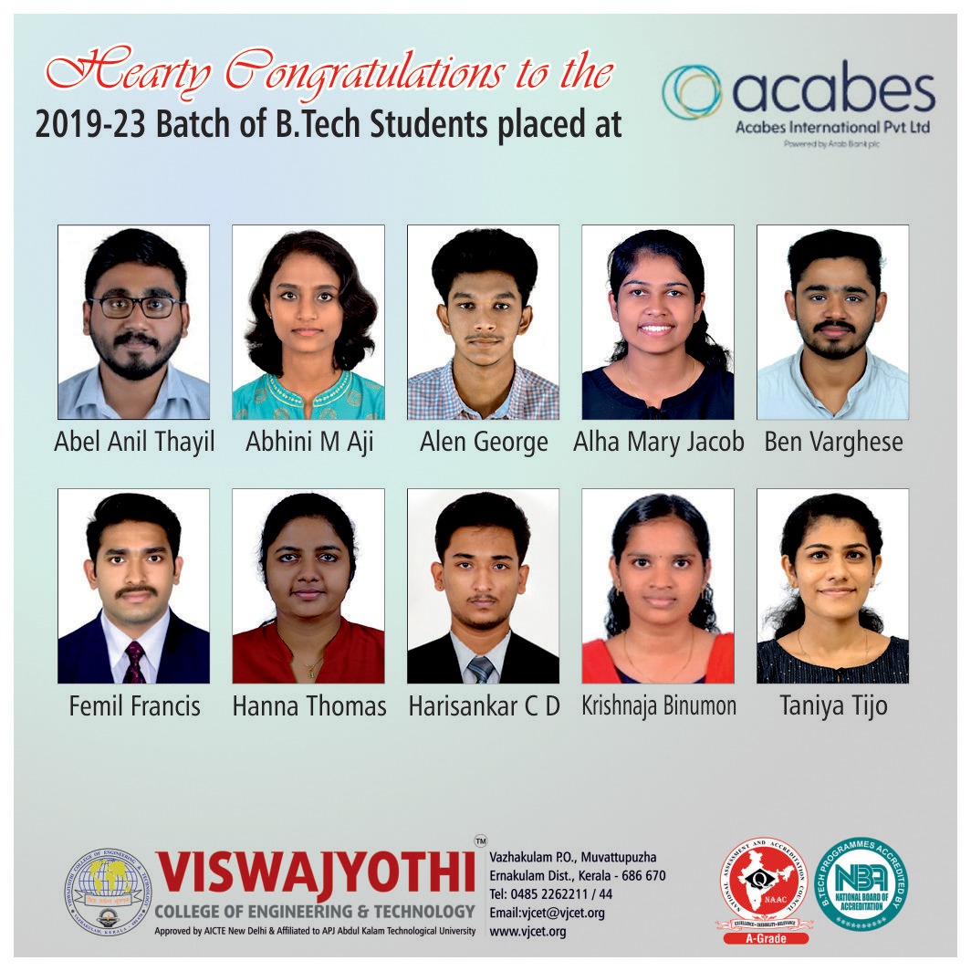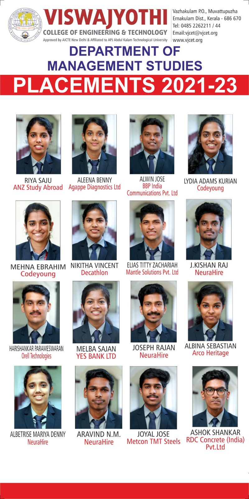 Over 50 companies visit the campus every year for recruitment for B.Tech & MBA. Some of the B. Tech highest packages are offered by – Infosys, Incture,TCS,EY,Nissan,Experion,6D Technologies,Qbrust,Quest Global,Tech Mahindra,Envestnet,RDC Concrete ,South Indian Bank & Federal Bank. The average package is 4 LPA.Some of the MBA highest packages are offered by :- HTIC, Eastern,Reliance Jio,ESAF,Alight Solutions,Excelledia,Techmaghi ,Planet Spark,Codeyoung,We Peejay Ventures Private Limited,Metcon Steels.The average package is 4 LPA.