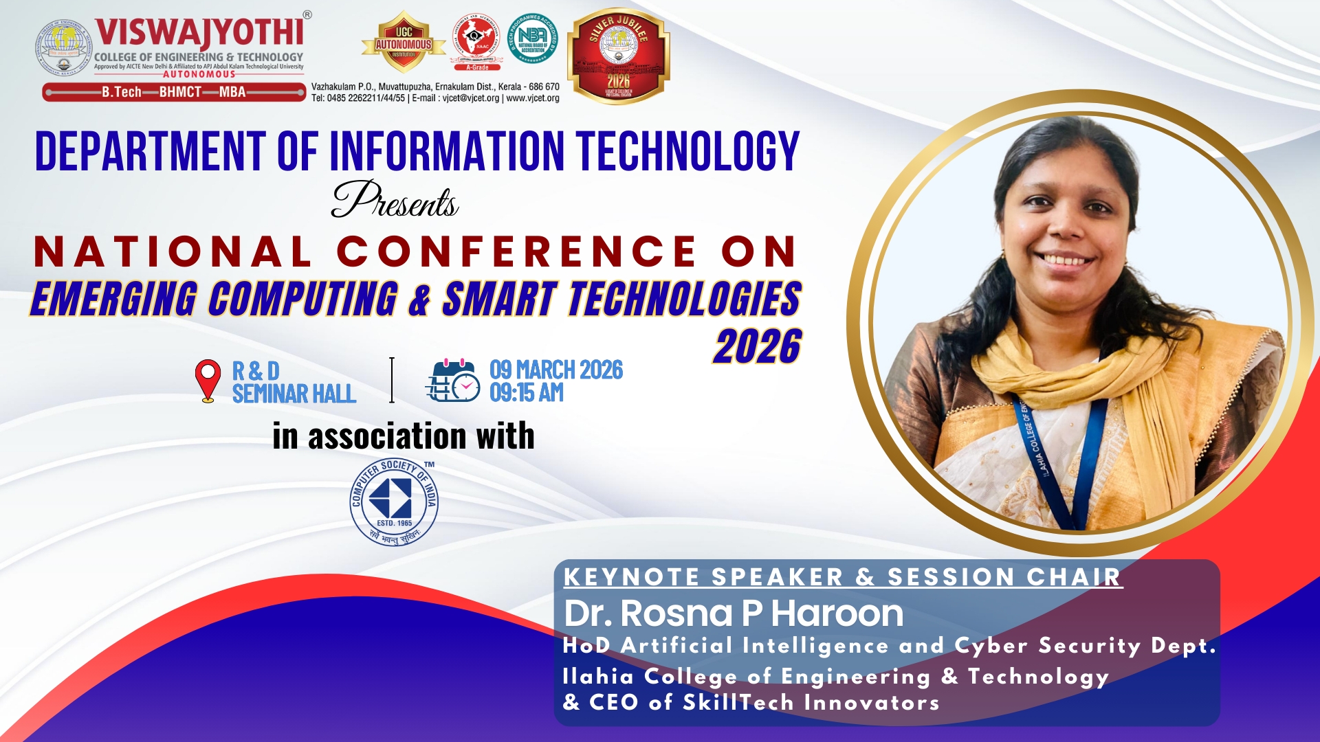 The National Conference “Emerging Computing & Smart Technologies 2026,” jointly organized by the Department of Information Technology and the Computer Society of India at Vishwajyothi Engineering College, was inaugurated by Dr. Rosna P. Harun, Head of the Department of Artificial Intelligence and Cyber Security at Ilahia College of Engineering & Technology, Muvattupuzha, CEO at Skilltech Innovators on March 9, 2026.