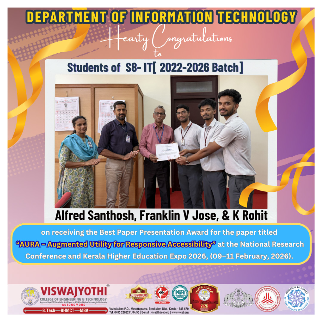 The Department of Information Technology, Viswajyothi College of Engineering & Technology (VJCET), successfully organized ORBIT–25, a technical event aimed at enhancing students’ awareness of current industry practices and essential technical skills.